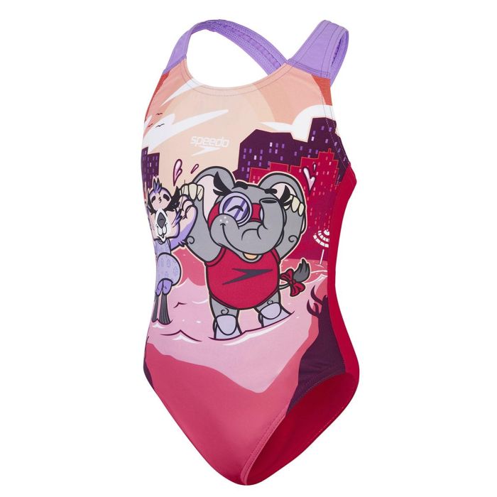 Perfect for splashing around, this charming girl's Speedo Learn to Swim Crossback swimsuit showcases a playful ocean scene starring Speedo's new Learn to Swim characters, Aria the Otter and Ellie the Elephant.